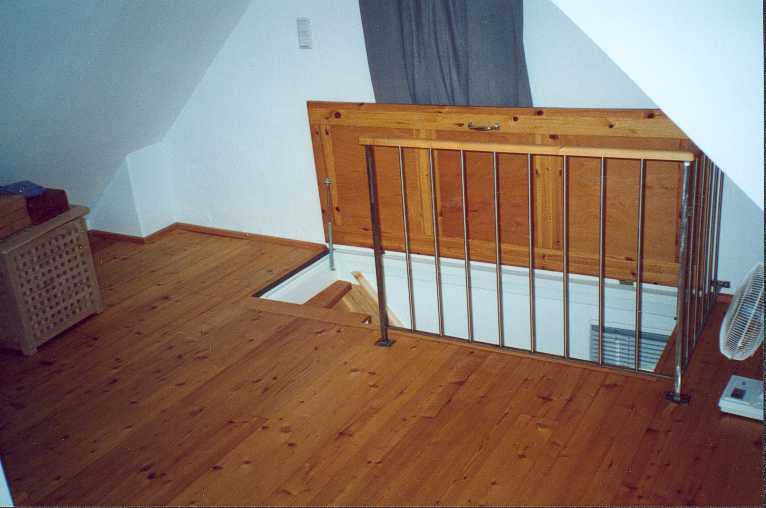 | Hier der Aufgang, Sicht von oben. Die Tür habe ich aus Resten des Dielenbodens gefertigt, das Geländer hat mir ein pensionierter Techniker geschweisst. Die Rundstäbe sind aus VA, die anderen Teile sind aus normalem Eisen, geschliffen und mit Zaponlack endbehandelt. | |